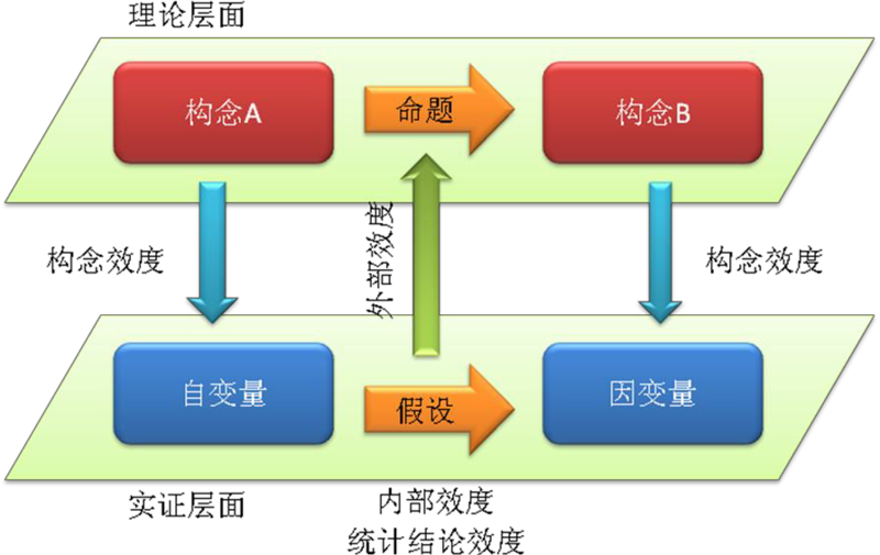 下图给出了不同的效度及其在理论和实证研究层面所处的位置。